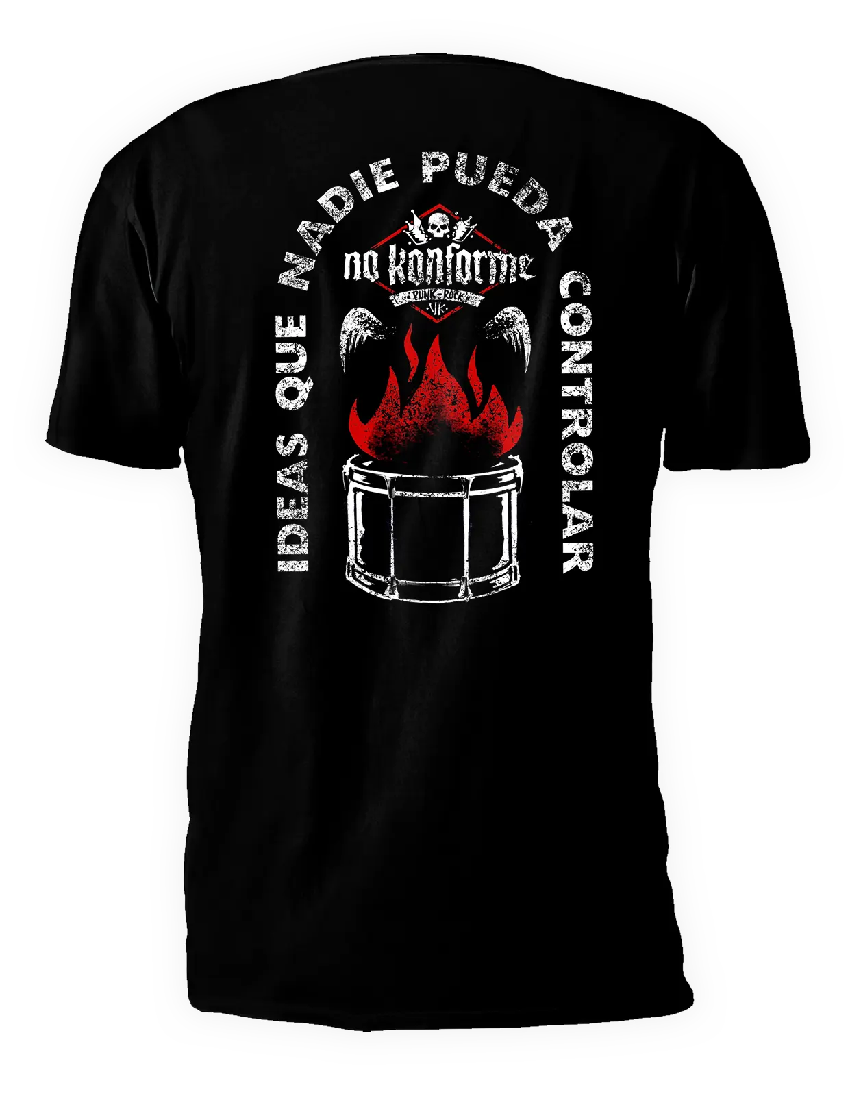 Camiseta con dibujo de Tambores de Guerra en el pecho en pequeño y grafico grande «Ideas que nadie pueda controlar» en espalda.